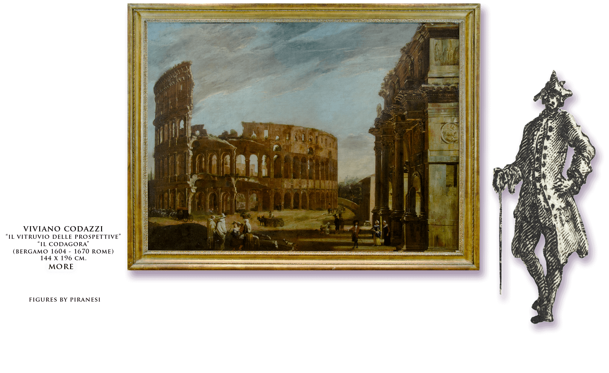 Piraneseum’s Catalog includes a variety of the more formative anecdotes (and juicier gossip) regarding many of the artists central to the phenomenon of Italian capricci. Included are nearly a dozen “names,” ranging from major to minor (as we’ve seen, some have, in the intervening centuries since they worked, been thought both major and minor). They are presented chronologically, beginning with the most important Italian High Baroque architectural painter – Vivianno Codazzi. Offered is a splendid, large and impressive veduta of the Colsseum and Arch of Constantine, dating to the 1650’s (fig. 6).