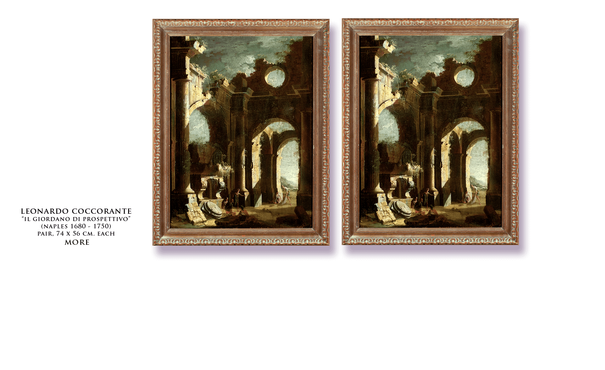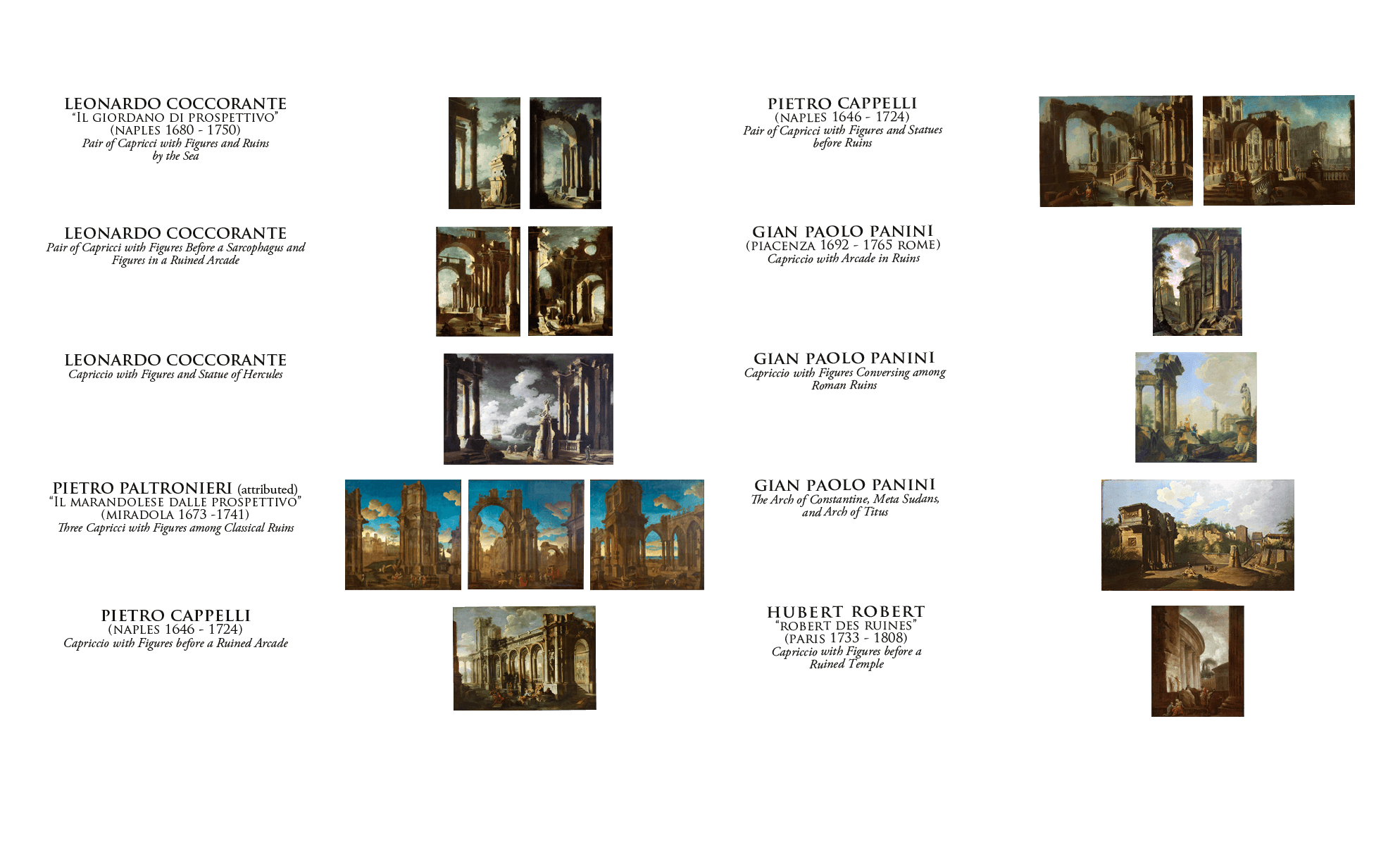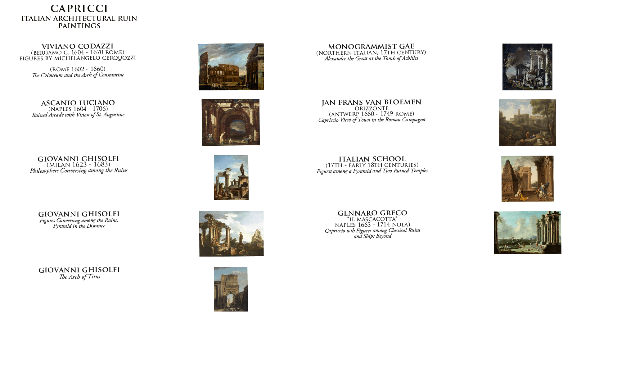 Perhaps some work in Piraneseum’s Catalog, featuring accomplished pictures by the entire range of the most talented artists – the greatest “names” – who painted in this rich and historically important tradition, will come to form the cornerstone for your own collection of capricci, as they have for others, over the course of four centuries.