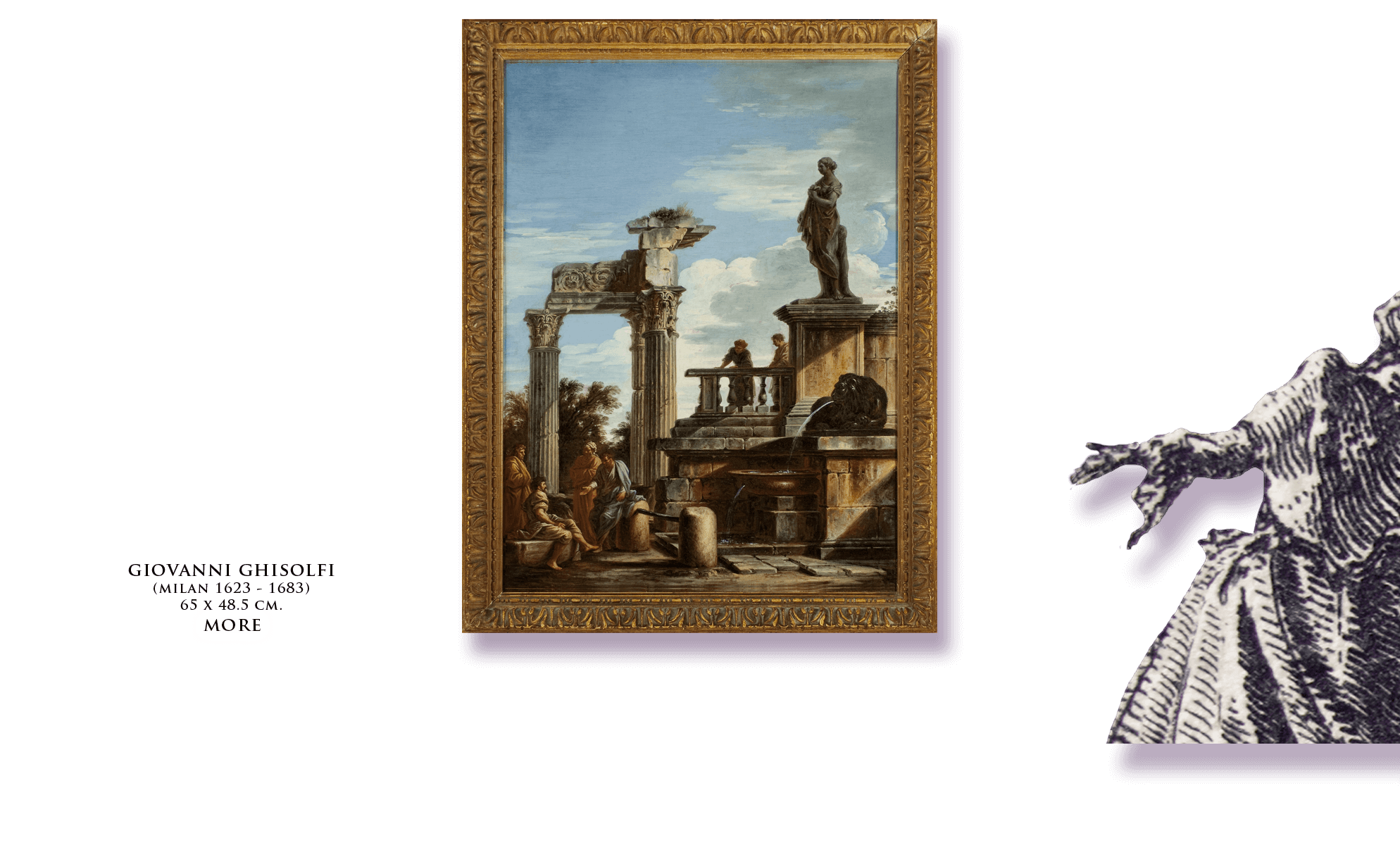 Interestingly, Ghisolfi also plays a role in another of this Catalog’s pictures – a classicizing view of Alexander at the Tomb of Achilles. Authorship is given to a somewhat mysterious artist, currently called the Monogrammist GAE. Art historians posit this likely northern Italian painter was either the young Ghisolfi, or a later artist working in Ghisolfi’s style.